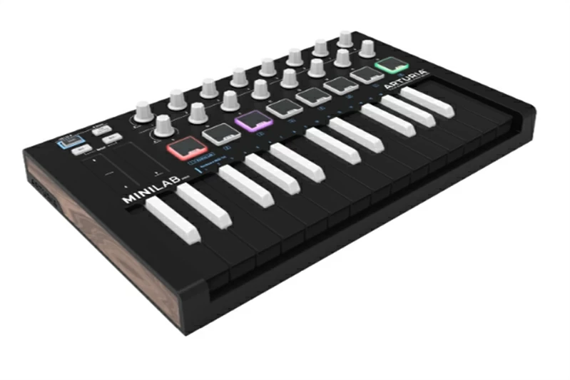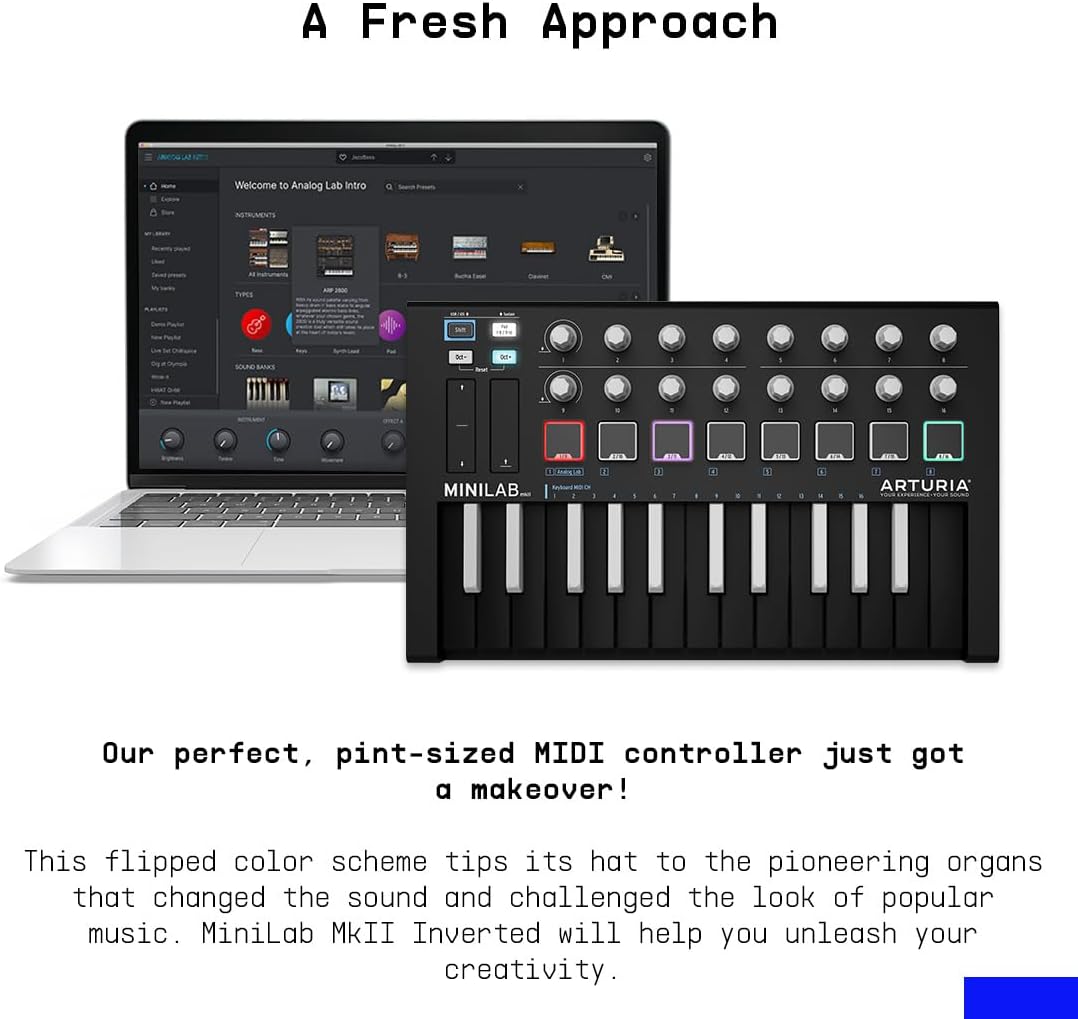 Le dimensioni compatte, la costruzione solida e l’integrazione con Analog Lab rendono il MiniLab MK2 Black una soluzione ideale tanto per l’home studio quanto per il live. I pad retroilluminati RGB e gli encoder assegnabili permettono una gestione creativa e fluida dei parametri, mentre la tastiera a 25 tasti offre una buona risposta espressiva.