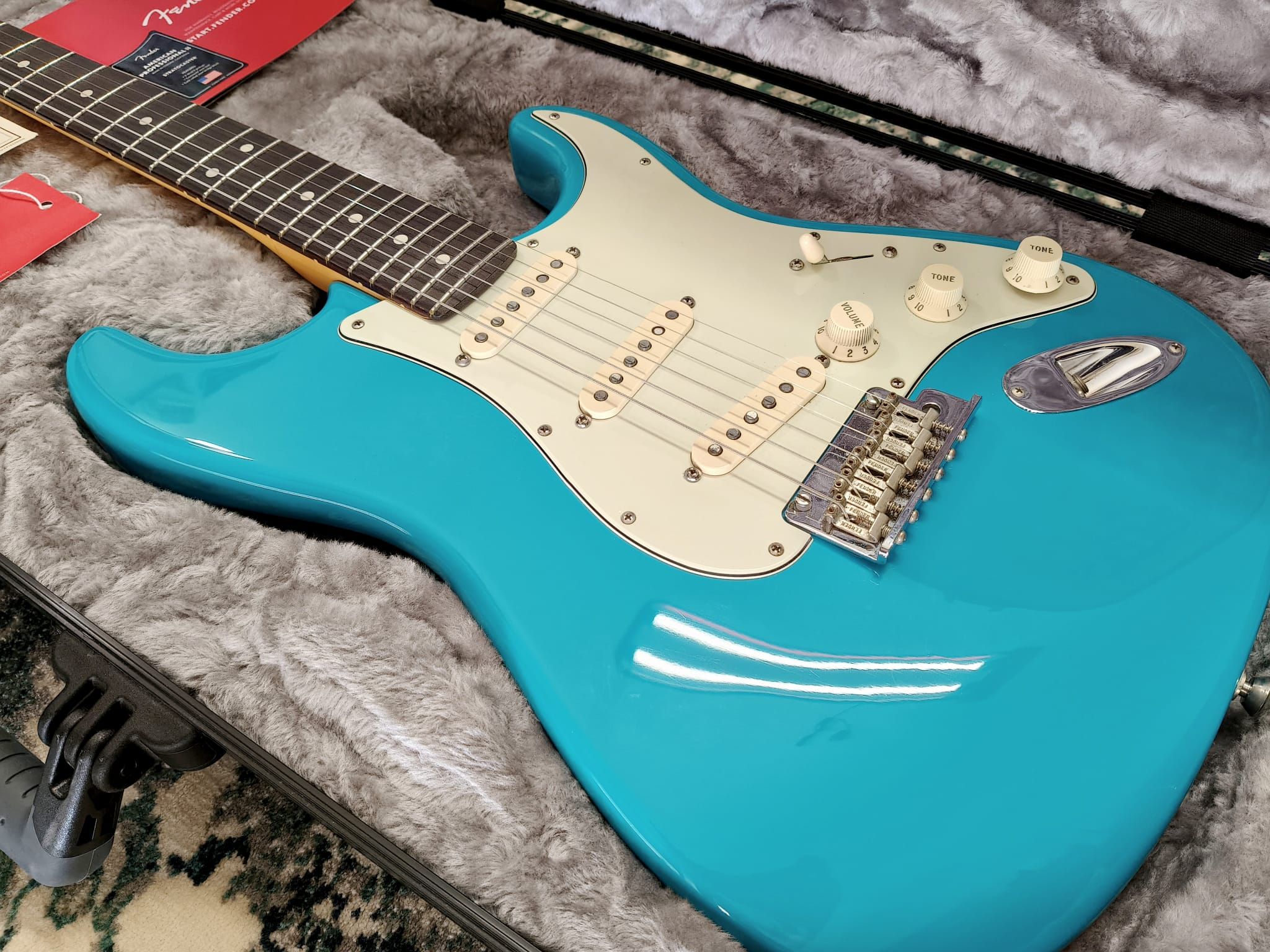 La Fender American Professional II Stratocaster Miami Blue rappresenta l’eccellenza del suono e del design Fender made in USA.