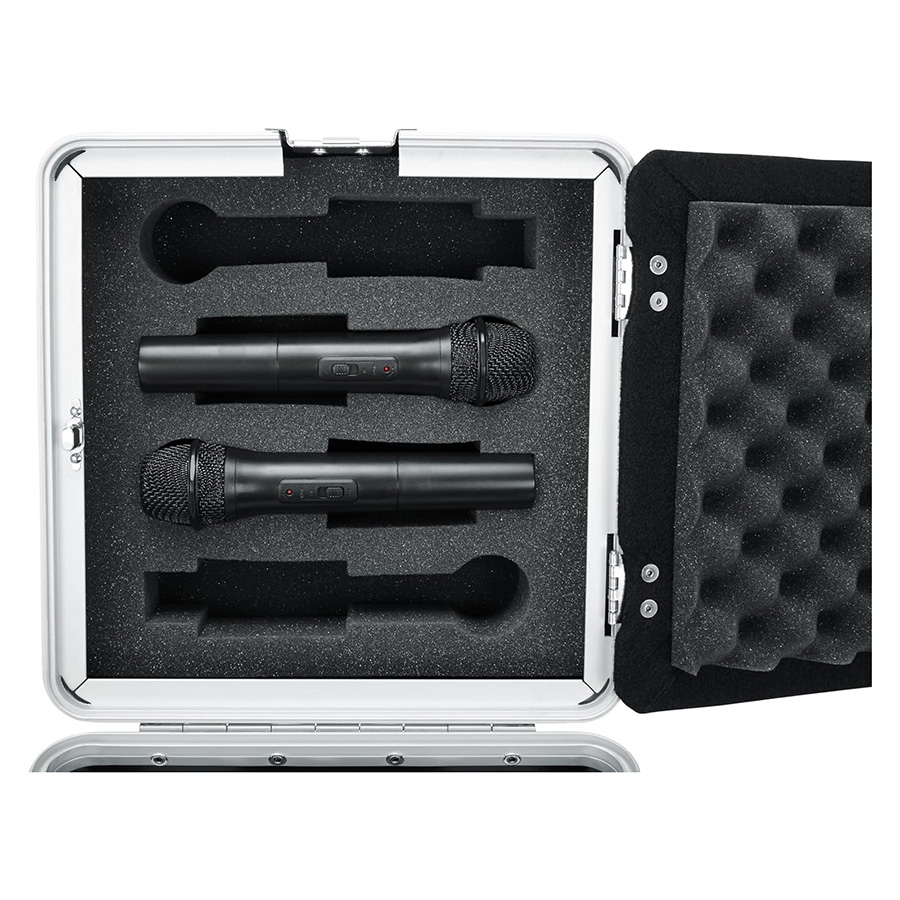 L’interno è foderato in moquette antigraffio e sagomato per ospitare 4 ricevitori wireless half-rack e 4 microfoni palmari sotto il coperchio. Include vani per clip, antipop e accessori.