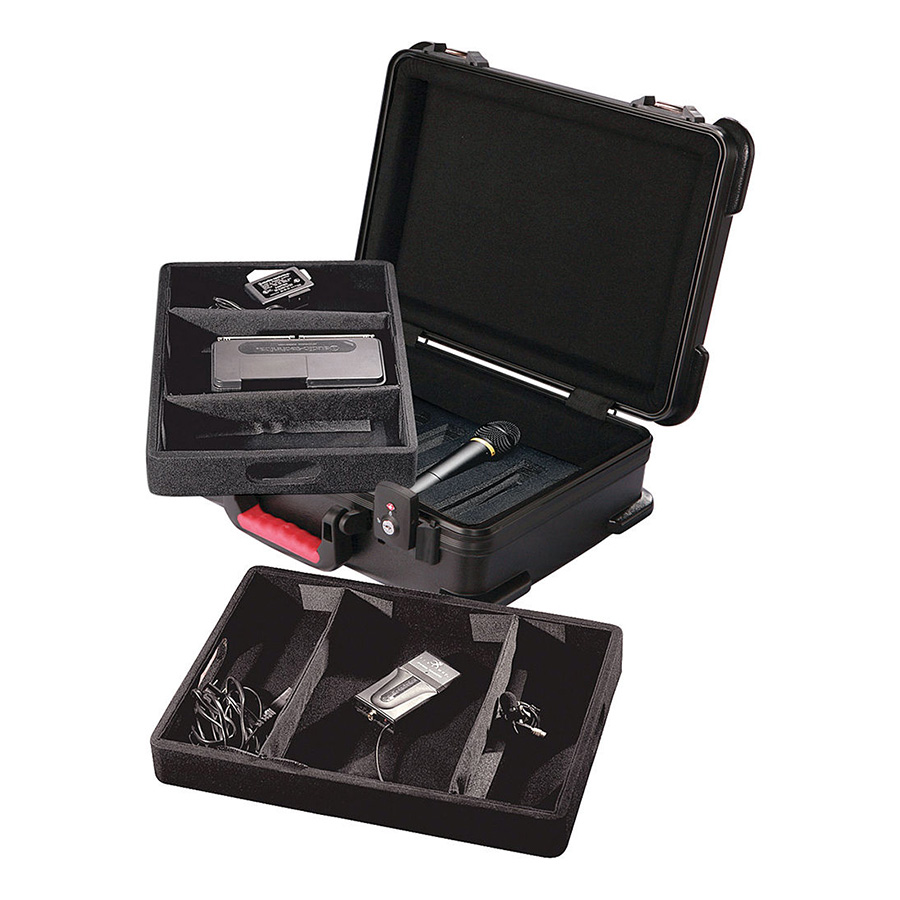All’interno, la GM-7W-TSA offre alloggiamenti sagomati per 7 microfoni wireless lunghi fino a 26,67 cm, oltre a due vassoi estraibili con divisori regolabili per ricevitori, trasmettitori beltpack e accessori. Il rivestimento interno in tricot morbido protegge le superfici delicate degli strumenti.