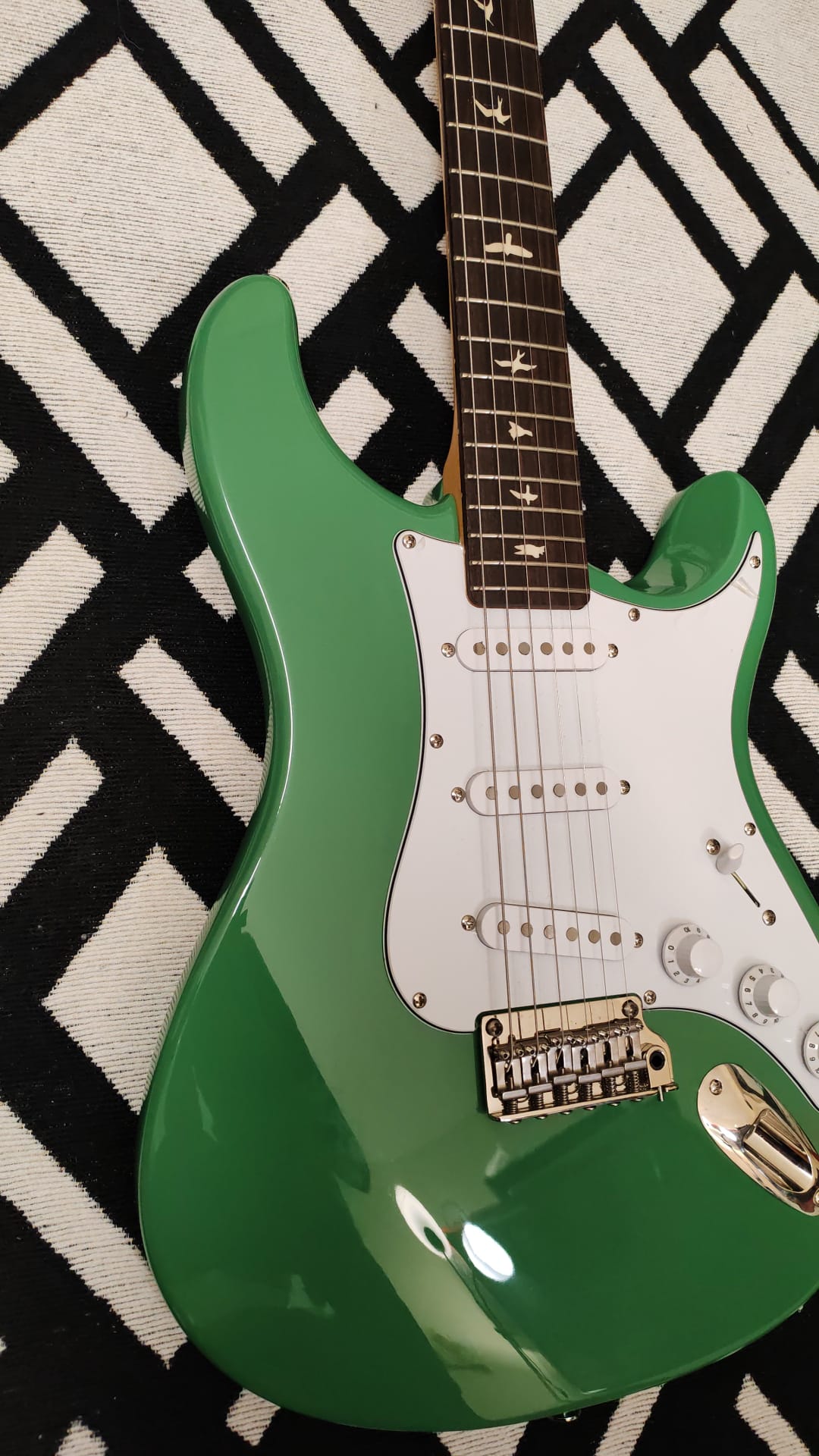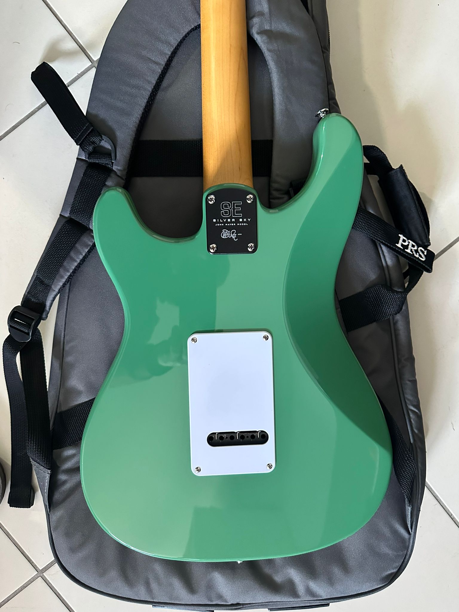 PRS SE Silver Sky John Mayer Ever Green, usata e possibile permuta. Pickup PRS, corpo in mogano, manico in acero e tastiera in palissandro. Suono brillante e versatile, pronta per studio e live.